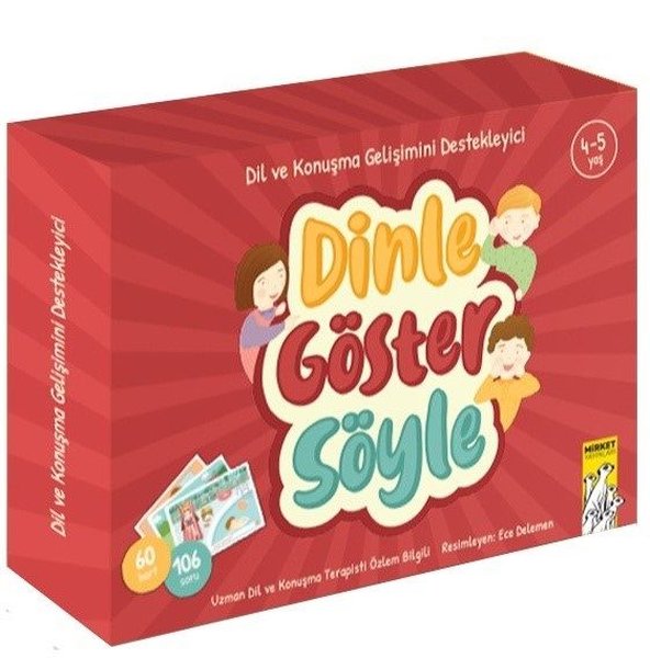 Dinle Göster Söyle kartları 4-5 yaş grubu çocukların alıcı dil, ifade edici dil ve işitsel dikkat becerilerini geliştirmek amacıyla hazırlanmıştır.