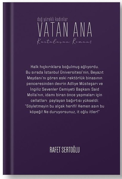 VATAN ANA / Dağ Yürekli Kadınlar Türk edebiyatının usta kalemi Rafet Sertoğlu, Türk'ün varoluş savaşına yer verdiği bu romanında, yarattığı büyüleyici kurtuluş mücadelesi atmosferinde Türk kadınının bilinmeyen ancak ete kemiğe bürünmüş kahramanlığını anlatıyor. Sertoğlu edebiyatın gücü ve bütün inceliklerini göz önüne serdiği eserde, okurları bu defa 19. Yüzyılın sonlarına götürüyor. Uygarlıkların kültür ve ticaretteki cazibe merkezi Kayseri'de geçen roman, insanın mücadele, inanç, acı ve adanmışlık gibi zaman ve mekandan soyut duygularına tanıklığın yanı sıra, bu topraklarda asırlarca iç içe hayat süren Türk, Ermeni ve Rumların kader birlikteliklerinin yok edilişinin sebep ve sonuçlarını gözler önüne seriyor. Yurt ve ulus sevgisinin, özgürlük tutkusunun, savaşların ve kahramanların iç içe girdiği bu tarihsel roman, güncelliğini hiçbir zaman yitirmeyecek temalarıyla her yaştan okurun ilgisini çekecek.